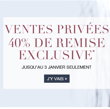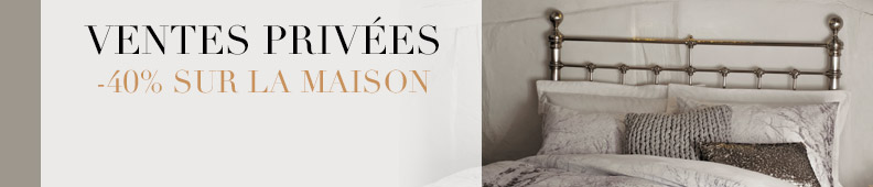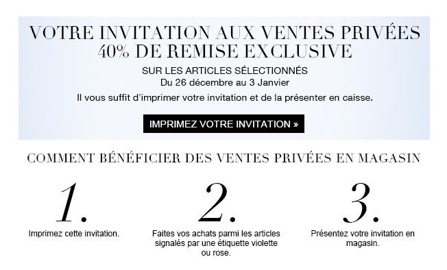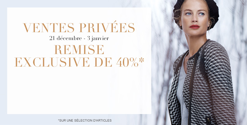 * -40% VENTES PRIVÉES Profitez d'une réduction de 40 % sur une sélection d'articles mode femme, mode homme, lingerie, maison et d'une réduction de 30 % sur une sélection d'articles mode enfant sur Marks & Spencer – Women's, Men's & Kids Clothing – Lingerie - Homeware du 21/12/2014 9h30 au 03/01/2015 minuit. La section dédiée aux VENTES PRIVÉES sur notre boutique en ligne n'est accessible que depuis le lien indiqué dans l’email d'invitation. La réduction en ligne ne sera appliquée qu’aux articles apparaissant dans la section dédiée aux VENTES PRIVÉES sur notre boutique en ligne après avoir cliqué sur le lien indiqué dans l’email d'invitation. En magasin, la remise sera effectuée lors du paiement en caisse sur présentation de l'Email d'invitation imprimé du 26/12/2014 au 03/01/2015. Les articles concernés par cette offre sont signalés par une pastille de couleur violette pour les produits Mode à -40% et par une pastille de couleur rose pour les produits Enfant à -30%. Offre non cumulable avec toute autre remise ou promotion en cours en ligne et en magasin. L'offre exclut la remise -20% sur le Linge de Maison. Tout remboursement prendra en compte la remise appliquée. Marks and Spencer se réserve le droit de refuser d’appliquer la promotion si les termes et conditions présentés ci-dessus ne sont pas respectés. Selon la disponibilité des stocks. Voir les conditions de vente et de livraison en ligne. L’offre n’inclut pas les frais de livraison. Photographie non contractuelle.