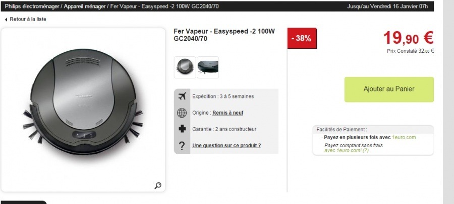 Bonjour en ce moment sur vente du diable dans la rubrique electromenagers, un aspirateur phillips est proposé au prix d'un fer a vapeur a 19 euro. Faites vite avant qu'ils s'en apercoivent!!!!
