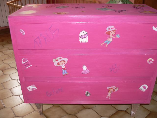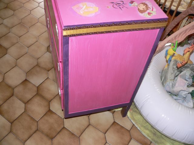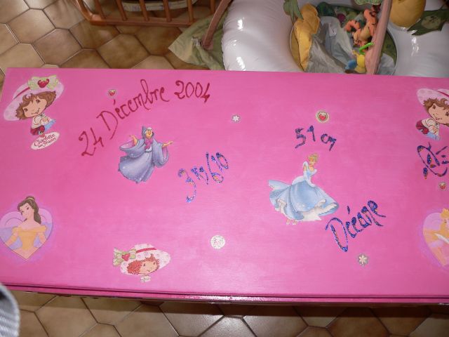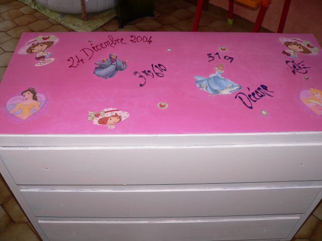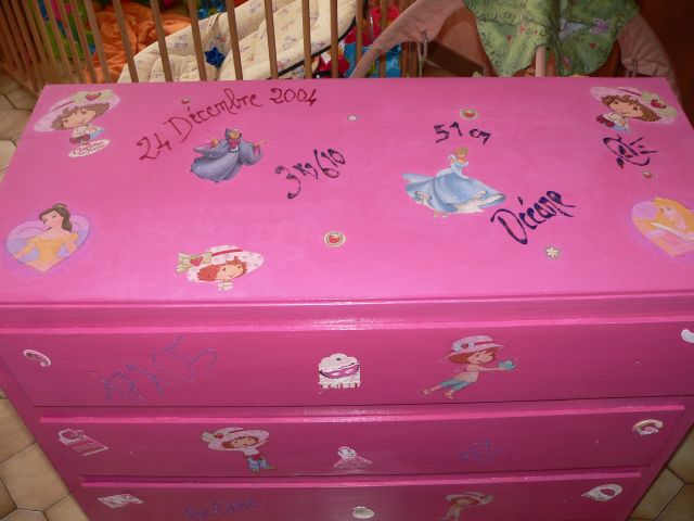 voici la commode que j'ai faite pour ma fille avec sa date heure poids et taille de naissance je l'ai faite a partir d'une vieille commode de famille par contre j'ai oublié de peindre les pieds:-D