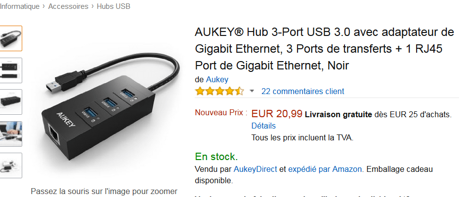 J'avais remarqué le Aukey hub 3 ports USB en promo du jour à 15€ mais sans RJ45