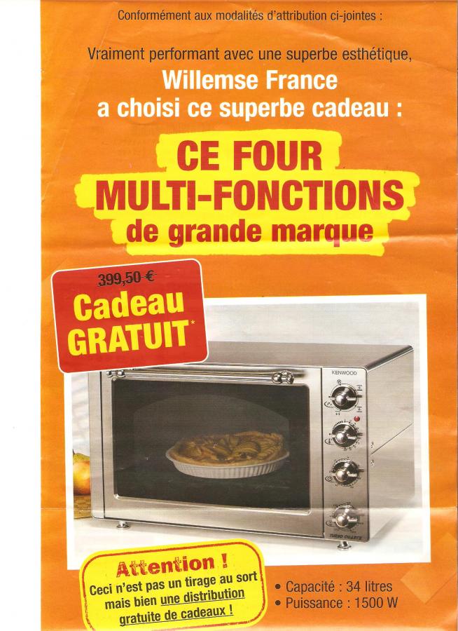 et l'asterix à coté de cadeau gratuit avec le prix du four ramene à quoi? peut etre la description d'un autre four comme ils font souvent dans les VPC on te montre le beau cadeau en photo et quand tu lis la liste des cadeaux reellement distribues parfois tu rigoles bien que chez willeme ils ont l'air de faire de beaux cadeaux