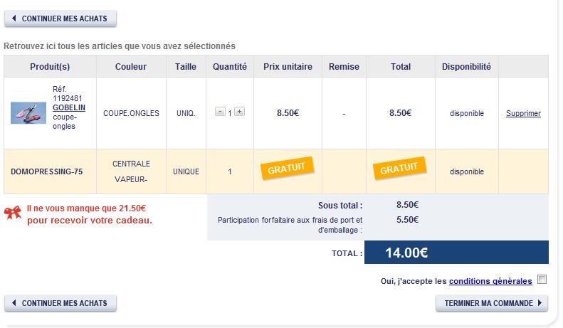 Merci pour ta réponse clarkgaybeul, mais j'ai pas bien compris :oops: lorsque je veux acheter le coupe-ongle, et que j'ajoute le code, le total s'élève à 14€ :cry: