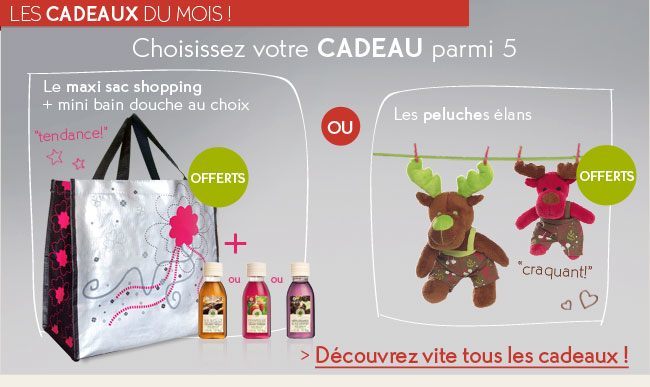 Bénéficiez de jusque -50% + en cadeau le sac shopping et le mini gel douche ou les deux peluches et les fdp gratuits dés 15 euros d'achat avec le code: